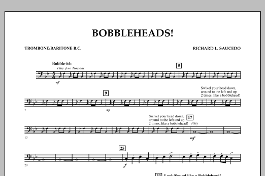 Here's a very easy novelty number that captures the fun and goofiness of bobblehead dolls. With clever visual and vocal effects, plus some percussion feature spots, this is sure to be enjoyed by players and audience alike. Dur: 2:00