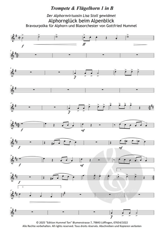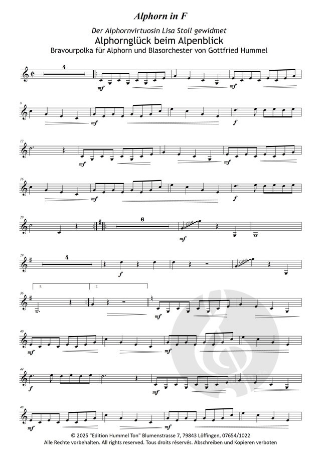 Der Anblick der Berge hat immer etwas erhabenes und romantisch Schönes. Welch ein Instrument passt besser zum Alpenblick als das Alphorn. Da ist diese Virtuose Alphornpolka, die auch mit Bariton, Posaune oder Tenorhorn gespielt werden kann, ideal. (Noten im Stimmensatz erhalten). In dieser Ausgabe sorgt das Blasorchester für den zusätzlichen alpenländischen Schwung.