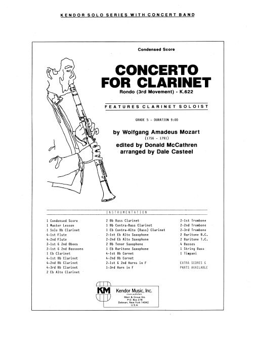 Completed in 1791 just before his death, Mozart wrote his Clarinet Concerto for the great clarinetist Anton Stadler. This final movement in classic rondo form features a recurring main theme, a secondary theme, and a brilliant closing section. In this master edition for modern bands, abundant articulations and dynamics have been added throughout to ensure a more musical performance. The set also includes a detailed Master Lesson by clarinetist Don McCathren (Duquesne University) to assist student soloists with preparation. Duration 9:00.