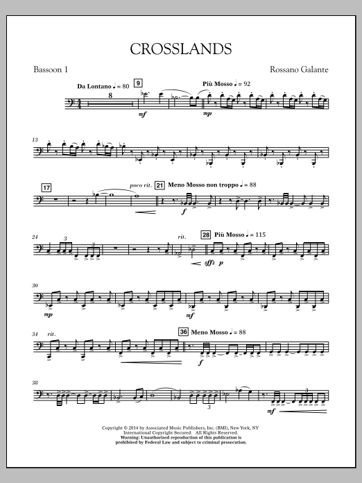 Creating a musical representation of earth's grand vistas and landscapes, Crosslands opens with a delicate, simple theme that is pastoral and reflective. Building to a bold heroic theme stated by trumpets and horns, the piece then concludes as the music subsides quietly representing the soft rays of a picturesque ocean sunset. Another beautifully descriptive work for winds from the pen of Rossano Galante. Dur: 4:10