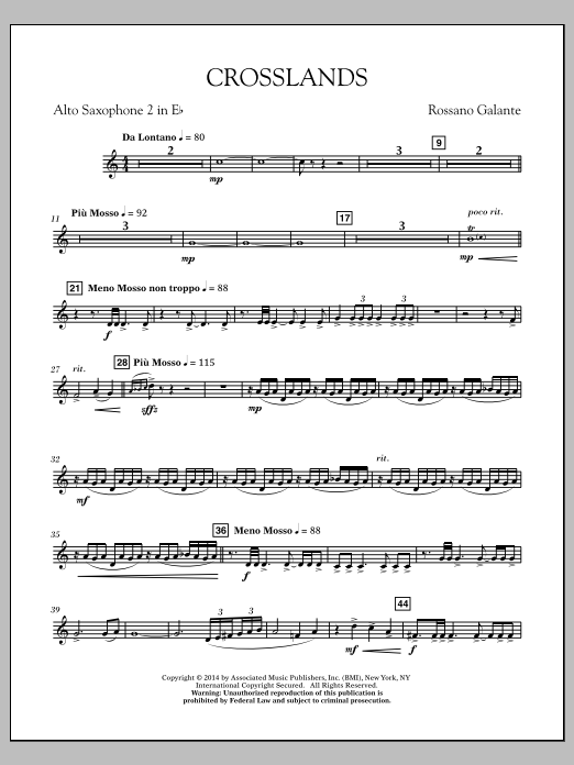 Creating a musical representation of earth's grand vistas and landscapes, Crosslands opens with a delicate, simple theme that is pastoral and reflective. Building to a bold heroic theme stated by trumpets and horns, the piece then concludes as the music subsides quietly representing the soft rays of a picturesque ocean sunset. Another beautifully descriptive work for winds from the pen of Rossano Galante. Dur: 4:10