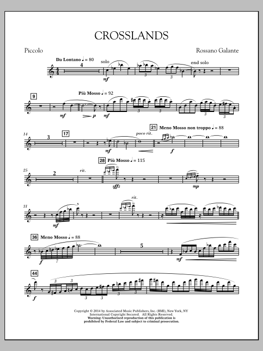 Creating a musical representation of earth's grand vistas and landscapes, Crosslands opens with a delicate, simple theme that is pastoral and reflective. Building to a bold heroic theme stated by trumpets and horns, the piece then concludes as the music subsides quietly representing the soft rays of a picturesque ocean sunset. Another beautifully descriptive work for winds from the pen of Rossano Galante. Dur: 4:10
