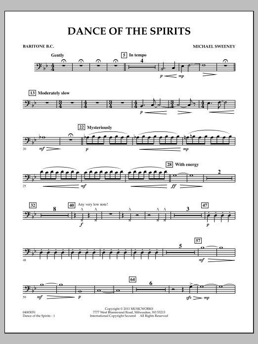 The Native American Cree tribe refer to the aurora borealis (or northern lights) as the dance of the spirits. Using a variety of unusual sounds and effects, quickly changing textures and surprises, Michael Sweeney has created a musical impression of this phenomenon's stunning beauty and unpredictable nature. An exciting and unique addition to the young band repertoire, this will be enjoyable to rehearse and perform. (Grade 2.5).