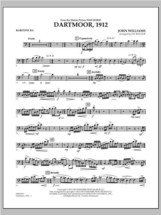The melodic and harmonic genius of John Williams is dramatically displayed in his powerful, yet sensitive film score from Steven Spielberg's War Horse. This symphonic setting for band exemplifies the character and warmth of the score from soloist passages to sweeping full ensemble themes.