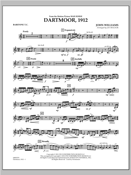 The melodic and harmonic genius of John Williams is dramatically displayed in his powerful, yet sensitive film score from Steven Spielberg's War Horse. This symphonic setting for band exemplifies the character and warmth of the score from soloist passages to sweeping full ensemble themes.