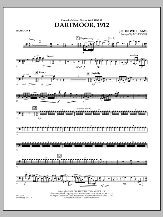 The melodic and harmonic genius of John Williams is dramatically displayed in his powerful, yet sensitive film score from Steven Spielberg's War Horse. This symphonic setting for band exemplifies the character and warmth of the score from soloist passages to sweeping full ensemble themes.
