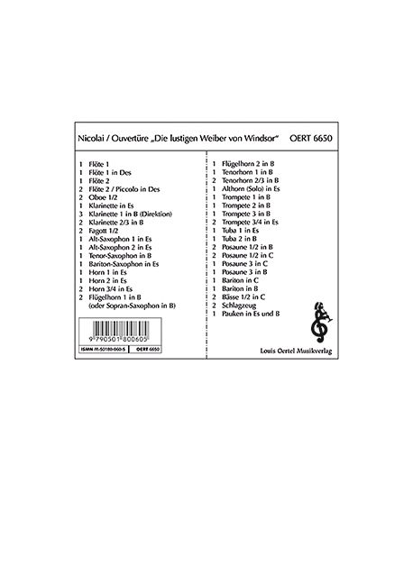Stimmensatz - 1 Flöte 1, 2 Flügelhorn 1 in B (oder Sopran-Saxophon in B); 1 Flöte 1 in Des; 1 Flügelhorn 2 in B; 1 Flöte 2; 1 Tenorhorn 1 in B; 2 Flöte 2 / Piccolo in Des; 2 Tenorhorn 2/3 in B; 2 Oboe 1/2; 1 Althorn (Solo) in Es; 1 Klarinette in Es; 1 Trompete 1 in B; 3 Klarinette 1 in B (Direktion); 1 Trompete 2 in B; 2 Klarinette 2/3 in B; 1 Trompete 3 in B; 2 Fagott 1/2; 2 Trompete 3/4 in Es; 1 Alt-Saxophon in 1 Es; 1 Tuba 1 in Es; 1 Alt-Saxophon 2 in Es; 1 Tuba 2 in B; 1 Tenor-Saxophon in B; 2 Posaune 1/2 in B; 1 Bariton-Saxophon in Es; 2 Posaune 1/2 in C; 1 Horn 1 in Es; 1 Posaune 3 in C; 1 Horn 2 in Es; 1 Posaune 3 in B; 2 Horn 3/4 in Es; 1 Bariton in C; 1 Bariton in B; 2 Bässe 1/2 in C; 2 Schlagzeug; 1 Pauken in Es und B - Blasorchester
