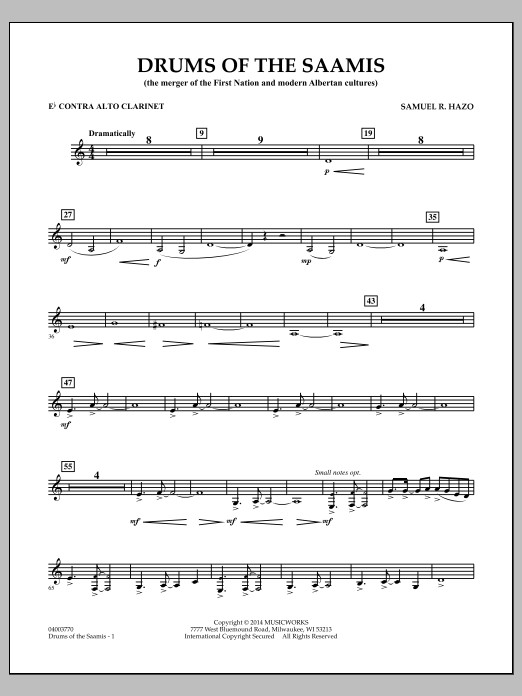 Drums of the Saamis wurde von der Medicine Hat Concert Band Society in Medicine Hat, Alberta, Kanada, in Auftrag gegeben. Das Stück erzählt von der Verschmelzung der Kulturen der First Nation (Ureinwohner) und der modernen Albertaner. Die einleitenden Stammestrommeln, gefolgt von der eindringlichen Melodie, die die traditionelle Holzflöte simuliert, bilden zwei Themen, die die Grundlage für das gesamte Stück bilden. Beide Elemente werden im Laufe des Stücks weiterentwickelt, variiert und verstärkt, während der Zuhörer den zunehmenden Einfluss des modernen Alberta durch die Verwendung modern klingender Akkorde und Rhythmen spürt. Am Ende ist die Vermählung von Altem und Neuem vollendet. Dieses kraftvolle Werk schließt so, wie es begonnen hat: eine Wiederaufnahme von Themen, die die musikalische und historische Grundlage der Region repräsentieren. Dauer 5:00
