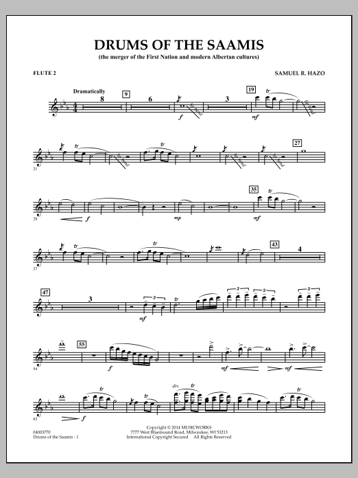 Drums of the Saamis wurde von der Medicine Hat Concert Band Society in Medicine Hat, Alberta, Kanada, in Auftrag gegeben. Das Stück erzählt von der Verschmelzung der Kulturen der First Nation (Ureinwohner) und der modernen Albertaner. Die einleitenden Stammestrommeln, gefolgt von der eindringlichen Melodie, die die traditionelle Holzflöte simuliert, bilden zwei Themen, die die Grundlage für das gesamte Stück bilden. Beide Elemente werden im Laufe des Stücks weiterentwickelt, variiert und verstärkt, während der Zuhörer den zunehmenden Einfluss des modernen Alberta durch die Verwendung modern klingender Akkorde und Rhythmen spürt. Am Ende ist die Vermählung von Altem und Neuem vollendet. Dieses kraftvolle Werk schließt so, wie es begonnen hat: eine Wiederaufnahme von Themen, die die musikalische und historische Grundlage der Region repräsentieren. Dauer 5:00