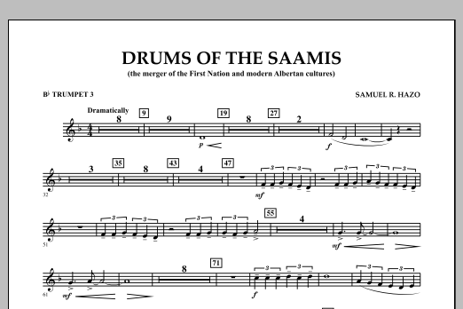 Drums of the Saamis wurde von der Medicine Hat Concert Band Society in Medicine Hat, Alberta, Kanada, in Auftrag gegeben. Das Stück erzählt von der Verschmelzung der Kulturen der First Nation (Ureinwohner) und der modernen Albertaner. Die einleitenden Stammestrommeln, gefolgt von der eindringlichen Melodie, die die traditionelle Holzflöte simuliert, bilden zwei Themen, die die Grundlage für das gesamte Stück bilden. Beide Elemente werden im Laufe des Stücks weiterentwickelt, variiert und verstärkt, während der Zuhörer den zunehmenden Einfluss des modernen Alberta durch die Verwendung modern klingender Akkorde und Rhythmen spürt. Am Ende ist die Vermählung von Altem und Neuem vollendet. Dieses kraftvolle Werk schließt so, wie es begonnen hat: eine Wiederaufnahme von Themen, die die musikalische und historische Grundlage der Region repräsentieren. Dauer 5:00