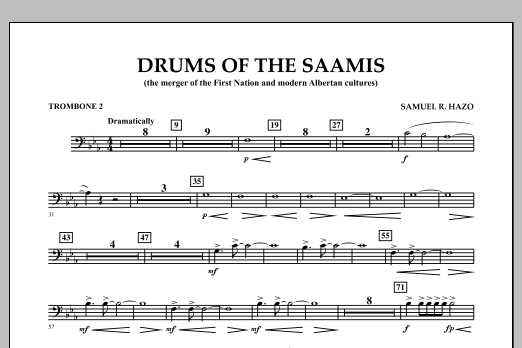 Drums of the Saamis wurde von der Medicine Hat Concert Band Society in Medicine Hat, Alberta, Kanada, in Auftrag gegeben. Das Stück erzählt von der Verschmelzung der Kulturen der First Nation (Ureinwohner) und der modernen Albertaner. Die einleitenden Stammestrommeln, gefolgt von der eindringlichen Melodie, die die traditionelle Holzflöte simuliert, bilden zwei Themen, die die Grundlage für das gesamte Stück bilden. Beide Elemente werden im Laufe des Stücks weiterentwickelt, variiert und verstärkt, während der Zuhörer den zunehmenden Einfluss des modernen Alberta durch die Verwendung modern klingender Akkorde und Rhythmen spürt. Am Ende ist die Vermählung von Altem und Neuem vollendet. Dieses kraftvolle Werk schließt so, wie es begonnen hat: eine Wiederaufnahme von Themen, die die musikalische und historische Grundlage der Region repräsentieren. Dauer 5:00