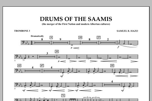 Drums of the Saamis wurde von der Medicine Hat Concert Band Society in Medicine Hat, Alberta, Kanada, in Auftrag gegeben. Das Stück erzählt von der Verschmelzung der Kulturen der First Nation (Ureinwohner) und der modernen Albertaner. Die einleitenden Stammestrommeln, gefolgt von der eindringlichen Melodie, die die traditionelle Holzflöte simuliert, bilden zwei Themen, die die Grundlage für das gesamte Stück bilden. Beide Elemente werden im Laufe des Stücks weiterentwickelt, variiert und verstärkt, während der Zuhörer den zunehmenden Einfluss des modernen Alberta durch die Verwendung modern klingender Akkorde und Rhythmen spürt. Am Ende ist die Vermählung von Altem und Neuem vollendet. Dieses kraftvolle Werk schließt so, wie es begonnen hat: eine Wiederaufnahme von Themen, die die musikalische und historische Grundlage der Region repräsentieren. Dauer 5:00