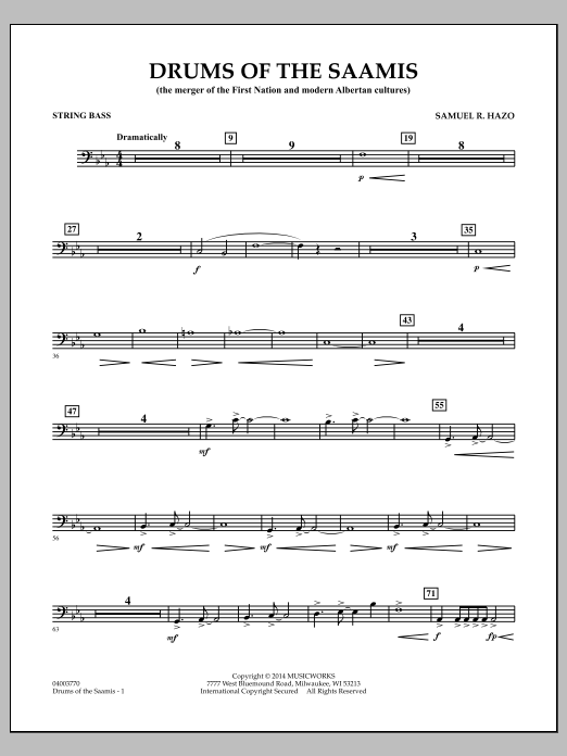 Drums of the Saamis wurde von der Medicine Hat Concert Band Society in Medicine Hat, Alberta, Kanada, in Auftrag gegeben. Das Stück erzählt von der Verschmelzung der Kulturen der First Nation (Ureinwohner) und der modernen Albertaner. Die einleitenden Stammestrommeln, gefolgt von der eindringlichen Melodie, die die traditionelle Holzflöte simuliert, bilden zwei Themen, die die Grundlage für das gesamte Stück bilden. Beide Elemente werden im Laufe des Stücks weiterentwickelt, variiert und verstärkt, während der Zuhörer den zunehmenden Einfluss des modernen Alberta durch die Verwendung modern klingender Akkorde und Rhythmen spürt. Am Ende ist die Vermählung von Altem und Neuem vollendet. Dieses kraftvolle Werk schließt so, wie es begonnen hat: eine Wiederaufnahme von Themen, die die musikalische und historische Grundlage der Region repräsentieren. Dauer 5:00