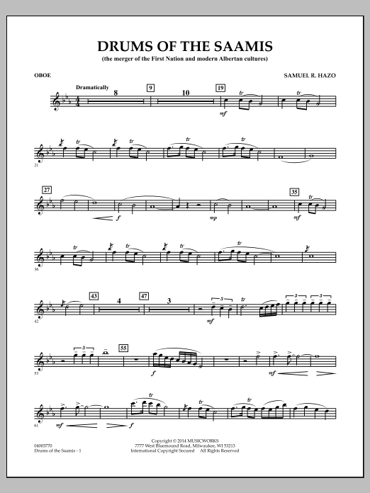 Drums of the Saamis wurde von der Medicine Hat Concert Band Society in Medicine Hat, Alberta, Kanada, in Auftrag gegeben. Das Stück erzählt von der Verschmelzung der Kulturen der First Nation (Ureinwohner) und der modernen Albertaner. Die einleitenden Stammestrommeln, gefolgt von der eindringlichen Melodie, die die traditionelle Holzflöte simuliert, bilden zwei Themen, die die Grundlage für das gesamte Stück bilden. Beide Elemente werden im Laufe des Stücks weiterentwickelt, variiert und verstärkt, während der Zuhörer den zunehmenden Einfluss des modernen Alberta durch die Verwendung modern klingender Akkorde und Rhythmen spürt. Am Ende ist die Vermählung von Altem und Neuem vollendet. Dieses kraftvolle Werk schließt so, wie es begonnen hat: eine Wiederaufnahme von Themen, die die musikalische und historische Grundlage der Region repräsentieren. Dauer 5:00
