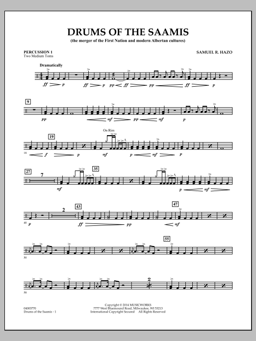 Drums of the Saamis wurde von der Medicine Hat Concert Band Society in Medicine Hat, Alberta, Kanada, in Auftrag gegeben. Das Stück erzählt von der Verschmelzung der Kulturen der First Nation (Ureinwohner) und der modernen Albertaner. Die einleitenden Stammestrommeln, gefolgt von der eindringlichen Melodie, die die traditionelle Holzflöte simuliert, bilden zwei Themen, die die Grundlage für das gesamte Stück bilden. Beide Elemente werden im Laufe des Stücks weiterentwickelt, variiert und verstärkt, während der Zuhörer den zunehmenden Einfluss des modernen Alberta durch die Verwendung modern klingender Akkorde und Rhythmen spürt. Am Ende ist die Vermählung von Altem und Neuem vollendet. Dieses kraftvolle Werk schließt so, wie es begonnen hat: eine Wiederaufnahme von Themen, die die musikalische und historische Grundlage der Region repräsentieren. Dauer 5:00