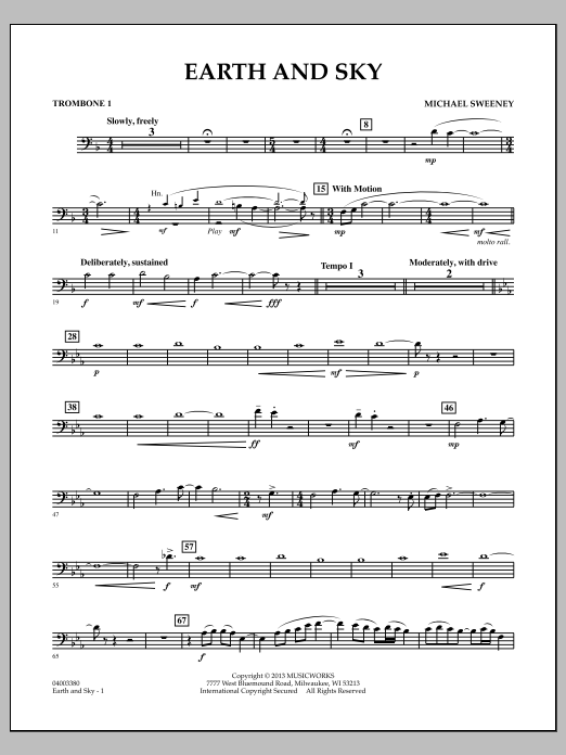 The Native American Omaha Tribe believed in an inseparable union between earth and sky. Commissioned for the Nebraska All-State 8th Grade Band, Michael Sweeney's Earth and Sky celebrates this ideal with a balance of woodwind motifs and delicate textures (sky) contrasted with an underlying percussion ostinato and feature spots (earth). Rich chordal accompaniments and soaring melodies provide continuity and flow in this dynamic work for band. Dur: 6:15