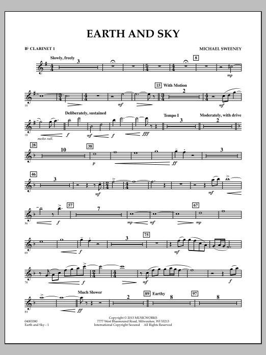 The Native American Omaha Tribe believed in an inseparable union between earth and sky. Commissioned for the Nebraska All-State 8th Grade Band, Michael Sweeney's Earth and Sky celebrates this ideal with a balance of woodwind motifs and delicate textures (sky) contrasted with an underlying percussion ostinato and feature spots (earth). Rich chordal accompaniments and soaring melodies provide continuity and flow in this dynamic work for band. Dur: 6:15