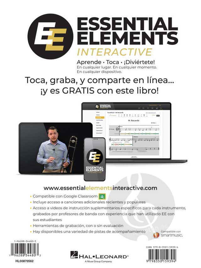 ¡El método de bandas líder en el mundo acaba de actualizarse! Essential Elements para Banda ofrece a los estudiantes principiantes una pedagogía sólida y música atractiva, todo ello cuidadosamente programado para iniciar con éxito a los jóvenes instrumentistas en su viaje musical. EE incluye canciones conocidas y ejercicios especialmente diseñados, creados, y adaptados para el aula en un entorno de aprendizaje al unísono, así como ejercicios específicos de cada instrumento para centrar a cada estudiante en las características únicas de su propio instrumento. EE proporciona tanto a profesores como a alumnos una gran cantidad de materiales para desarrollar la musicalidad total, incluso en las etapas iniciales.