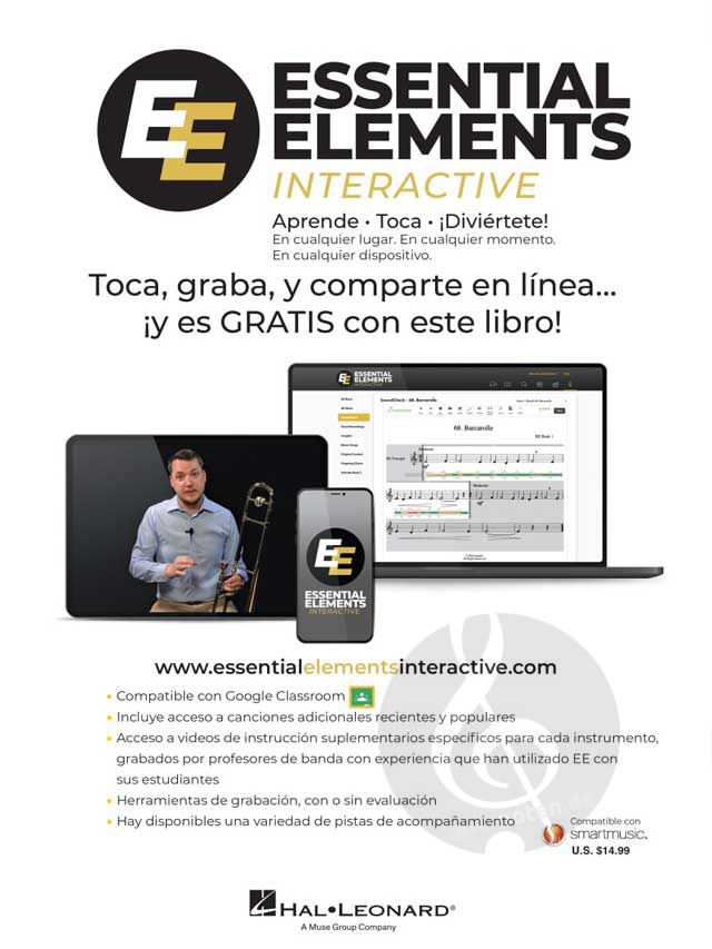 ¡El método de bandas líder en el mundo acaba de actualizarse! Essential Elements para Banda ofrece a los estudiantes principiantes una pedagogía sólida y música atractiva, todo ello cuidadosamente programado para iniciar con éxito a los jóvenes instrumentistas en su viaje musical. EE incluye canciones conocidas y ejercicios especialmente diseñados, creados, y adaptados para el aula en un entorno de aprendizaje al unísono, así como ejercicios específicos de cada instrumento para centrar a cada estudiante en las características únicas de su propio instrumento. EE proporciona tanto a profesores como a alumnos una gran cantidad de materiales para desarrollar la musicalidad total, incluso en las etapas iniciales.
