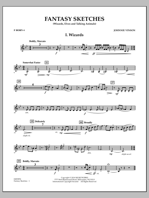 Drawing inspiration from books and films of fantasy adventure, Johnnie's three-movement suite explores a variety of descriptive moods and styles. The first movement (Wizards) has a noble and grand flavor, while the second (Elves) is more playful and mischievous in design. The concluding movement (Talking Animals) uses rhythmic energy and mixed meters in creating a bit of a rambunctious setting. Themes from the earlier movements are then brought back for the grand finale. Dur: 8:00