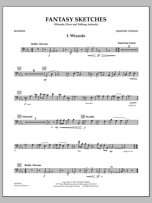 Drawing inspiration from books and films of fantasy adventure, Johnnie's three-movement suite explores a variety of descriptive moods and styles. The first movement (Wizards) has a noble and grand flavor, while the second (Elves) is more playful and mischievous in design. The concluding movement (Talking Animals) uses rhythmic energy and mixed meters in creating a bit of a rambunctious setting. Themes from the earlier movements are then brought back for the grand finale. Dur: 8:00