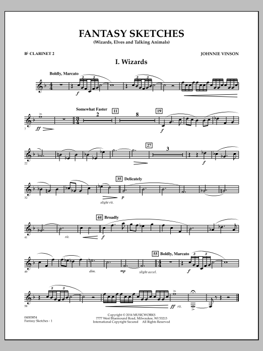 Drawing inspiration from books and films of fantasy adventure, Johnnie's three-movement suite explores a variety of descriptive moods and styles. The first movement (Wizards) has a noble and grand flavor, while the second (Elves) is more playful and mischievous in design. The concluding movement (Talking Animals) uses rhythmic energy and mixed meters in creating a bit of a rambunctious setting. Themes from the earlier movements are then brought back for the grand finale. Dur: 8:00