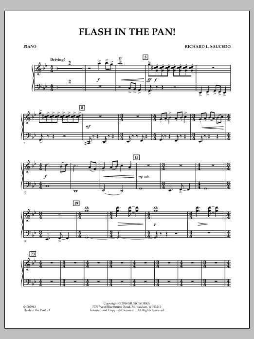 Composed in a single driving tempo, this dynamic and concise work provides plenty of excitement and flash. The playful main theme is accompanied by a rhythmic pattern alternating between 4/4 and 3/4. In addition, some quirky dissonant passages and percussion feature spots help to spice things up. Dur: 2:15