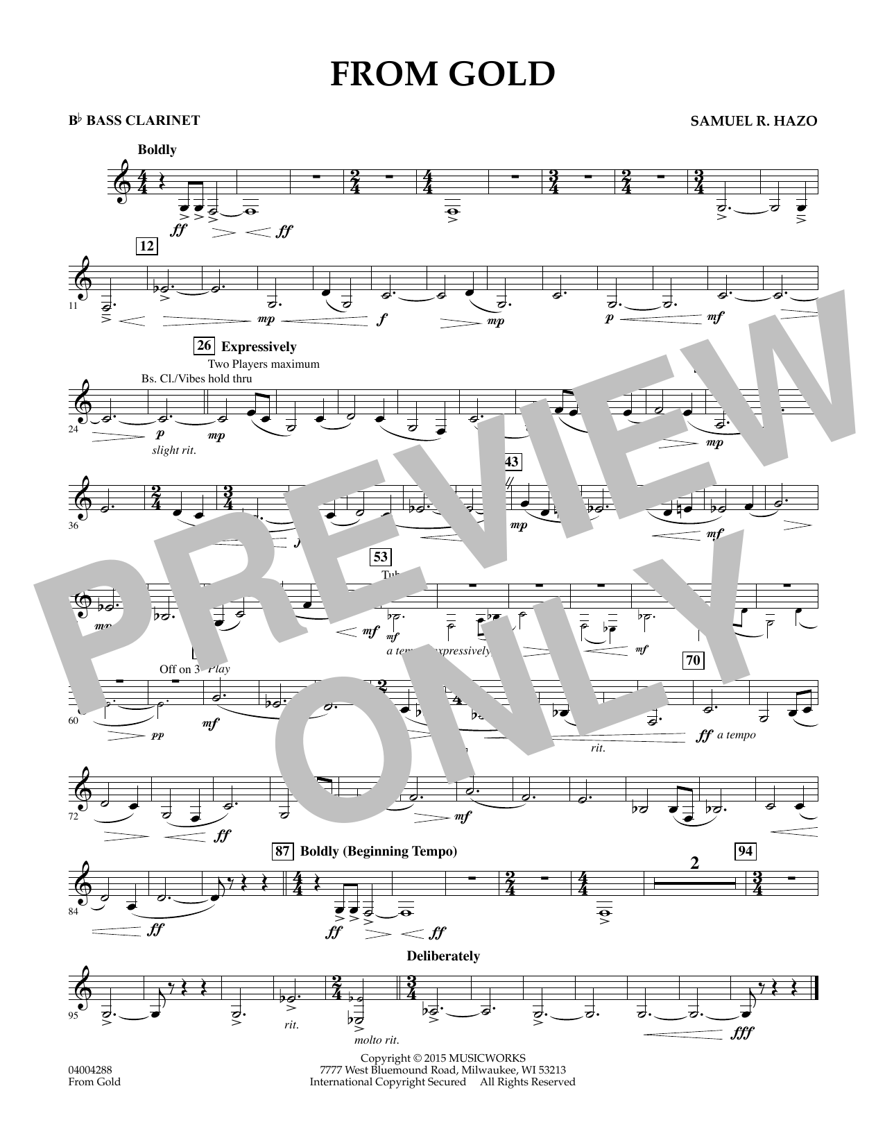 Glistening chords, soaring melodies, broad fanfares and gorgeous chorales will fill your concert hall with this evocative work. Best of all, From Gold sounds much harder than it actually is. Mr. Hazo's background as a music educator is evident in how quickly directors and students will get to the music making. Written entirely in B-flat with few accidentals, the runs are split between instruments for playability, and parts are doubled/cued to build confidence. Young bands will sound mature, and mature bands will be breathtaking. Dur: 4:35