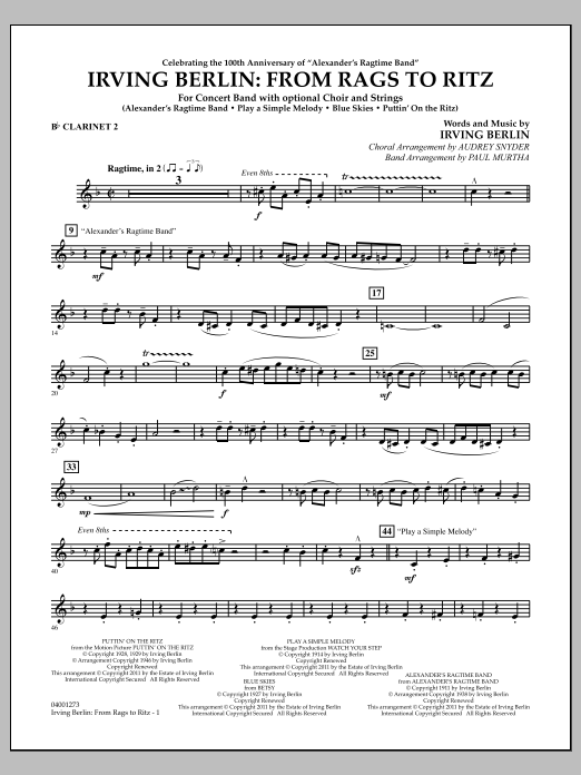 Celebrate the 100th anniversary of Irving Berlin's classic Alexander's Ragtime Band with this medley of four of his all-time greatest hits arranged for choir, band and strings! A fantastic closer or festival feature, it includes: Alexander's Ragtime Band, Blue Skies, Play a Simple Melody, Puttin' on the Ritz.