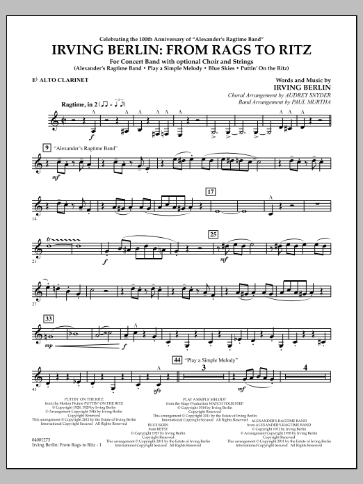Celebrate the 100th anniversary of Irving Berlin's classic Alexander's Ragtime Band with this medley of four of his all-time greatest hits arranged for choir, band and strings! A fantastic closer or festival feature, it includes: Alexander's Ragtime Band, Blue Skies, Play a Simple Melody, Puttin' on the Ritz.