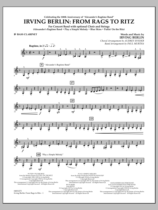 Celebrate the 100th anniversary of Irving Berlin's classic Alexander's Ragtime Band with this medley of four of his all-time greatest hits arranged for choir, band and strings! A fantastic closer or festival feature, it includes: Alexander's Ragtime Band, Blue Skies, Play a Simple Melody, Puttin' on the Ritz.