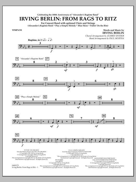 Celebrate the 100th anniversary of Irving Berlin's classic Alexander's Ragtime Band with this medley of four of his all-time greatest hits arranged for choir, band and strings! A fantastic closer or festival feature, it includes: Alexander's Ragtime Band, Blue Skies, Play a Simple Melody, Puttin' on the Ritz.