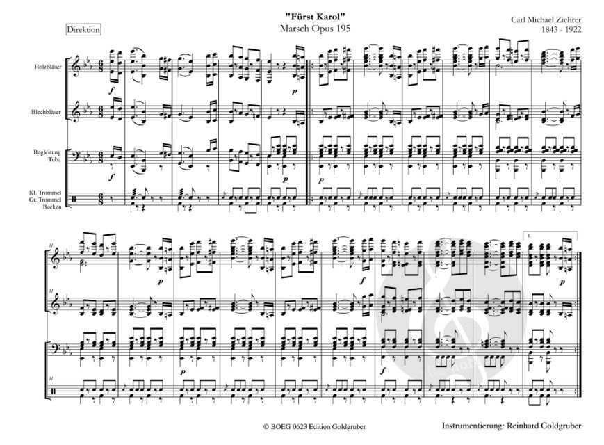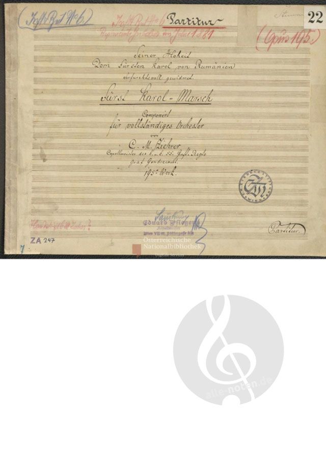 Carl Michael Ziehrer komponierte und instrumentierte den Marsch "Fürst Karol" Opus 195 im Original für Streichorchester in der Tonart Eb-Dur.
