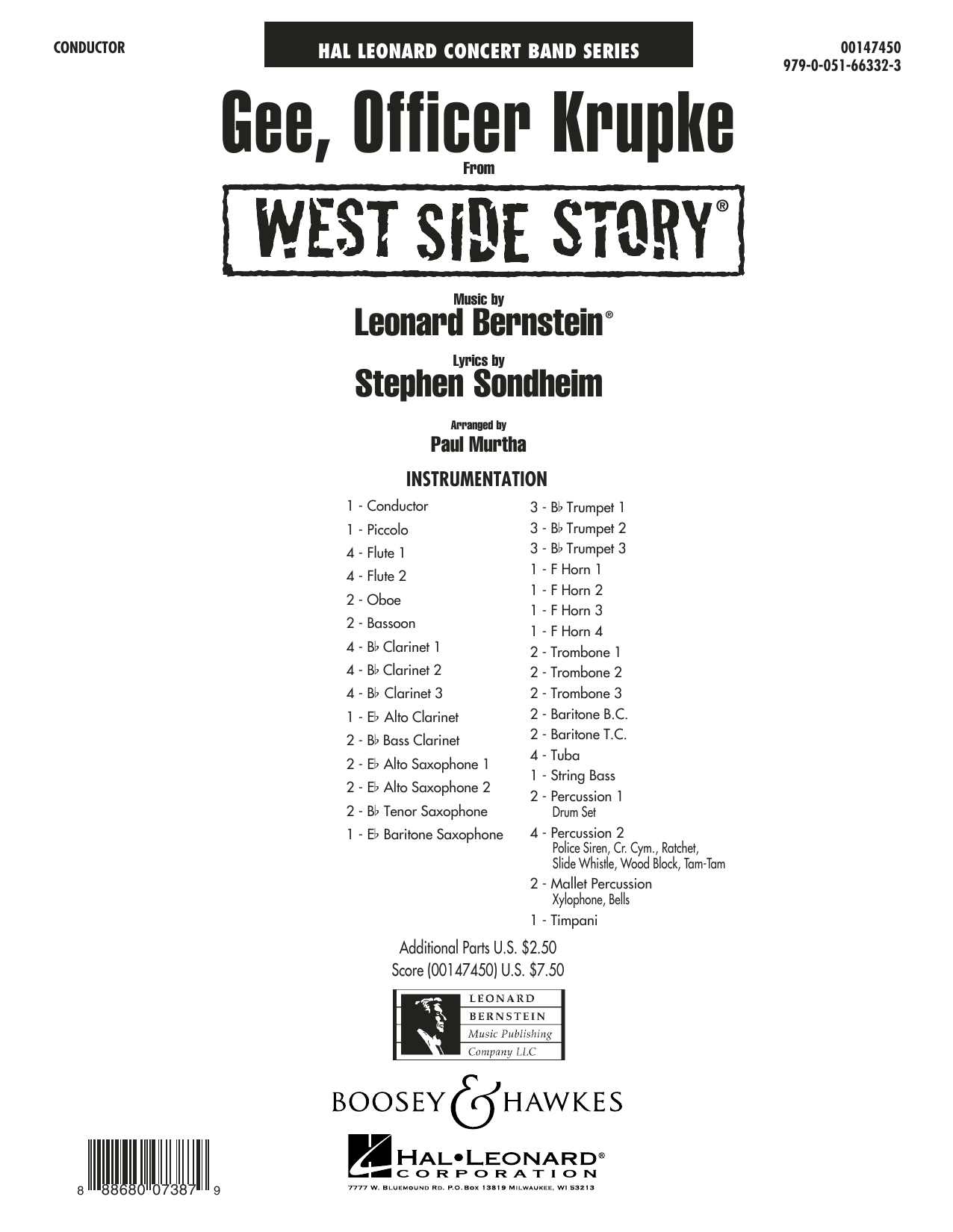In Bernsteins populärem Musical West Side Story wird dieser bekannte Song voller Energie und wildem Klamauk von den Jets gesungen. Die melodische Phrase zu Gee, Officer Krupke, mit der jede neue Strophe des Songs beginnt, verwendet Bearbeiter Paul Murtha hier sehr geschickt, um diesen tollen Song von der Musical- auf die Konzertbühne zu bringen.