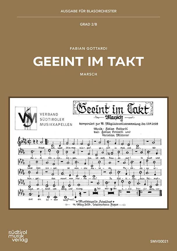 Der Marsch "Geeint im Takt" entstand anlässlich der 78. Mitgliedervollversammlung des Verbandes Südtiroler Musikkapellen (VSM). Jedes Jahr wird diese Versammlung musikalisch von einer Kapelle aus einem der sechs Musikbezirke des Landes gestaltet. Im Jahr 2026 fiel diese ehrenvolle Aufgabe der Musikkapelle Schalders zu, die den Bezirk Brixen vertrat. Um ein bleibendes Zeichen zu setzen, komponierte Kapellmeister Fabian Gottardi diesen Marsch mit Triogesang – eine Hommage an das Südtiroler Blasmusikwesen und seine lebendige Tradition. Der Marsch ist bewusst im klassisch-tirolerischen Stil gehalten: Ein flotter erster Teil mündet in ein kraftvolles Bass-Solo, bevor das Werk in ein gesungenes Trio übergeht. Der Text des Trios entstand in enger Zusammenarbeit mit dem Schalderer Schlagzeuger Christian Mitterer, dessen Ideen maßgeblich zur charakteristischen Note des Stücks beitrugen. Inhaltlich feiert der Text die Gemeinschaft der Südtiroler Blasmusikszene. Von Nord bis Süd erklingt Musik – gespielt oder gesungen – und genau diese tiefe Verbundenheit mit der Tradition bildet einen der Grundpfeiler der hiesigen Blasmusikkultur. Die Uraufführung des Marsches fand am 14. März 2026 im Waltherhaus in Bozen statt.