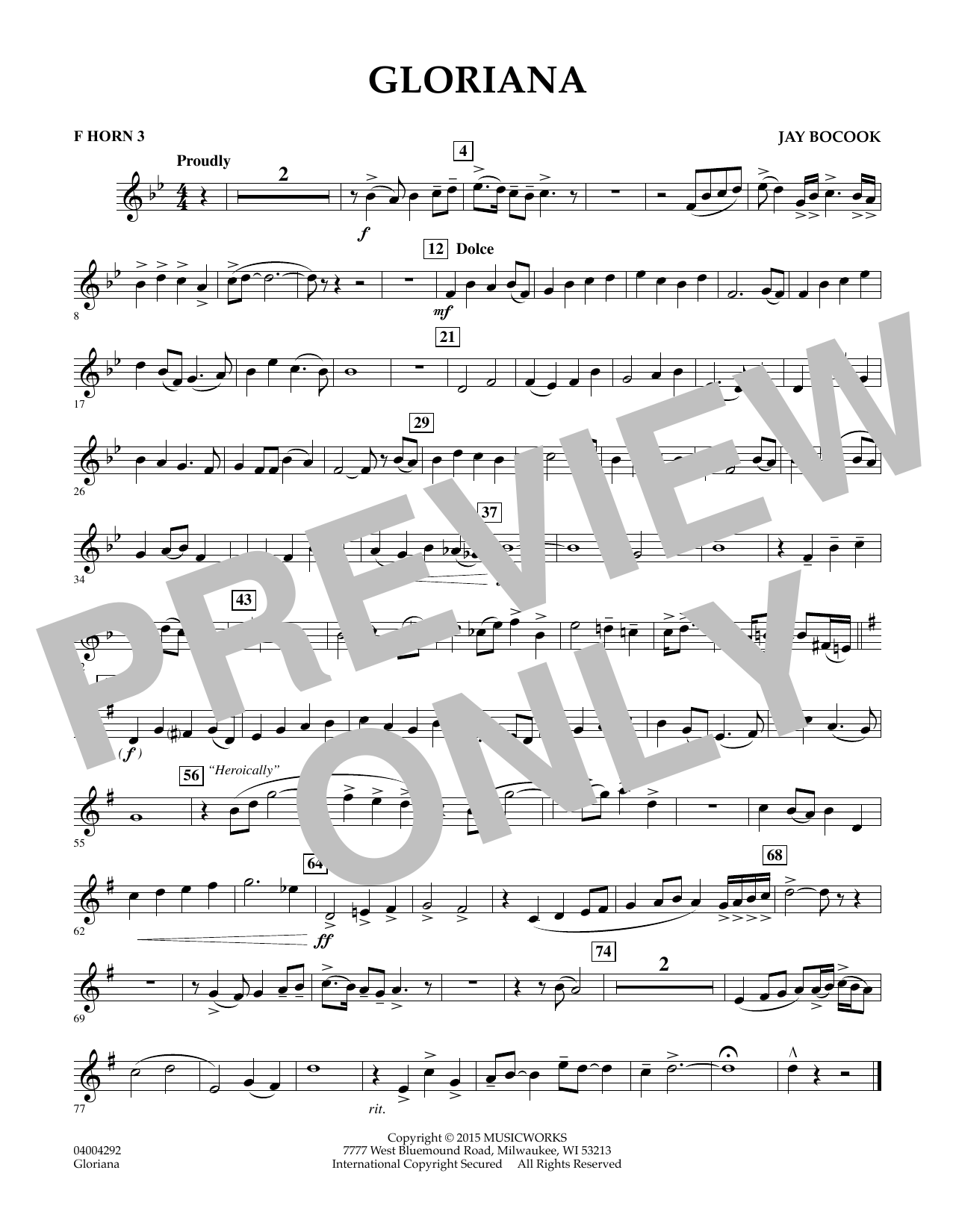 Gloriana' basiert auf dem englischen Gedicht'The Faerie Queene' von Edmund Spenser. Jay Bocooks Werk für sinfonisches Blasorchester besitzt einen königlichen Charakter mit dahingleitenden Melodien und fanfarenartigen Figuren der Blächbläser. Die optionale Orgelstimme erweitert das Klangerlebnis enorm.