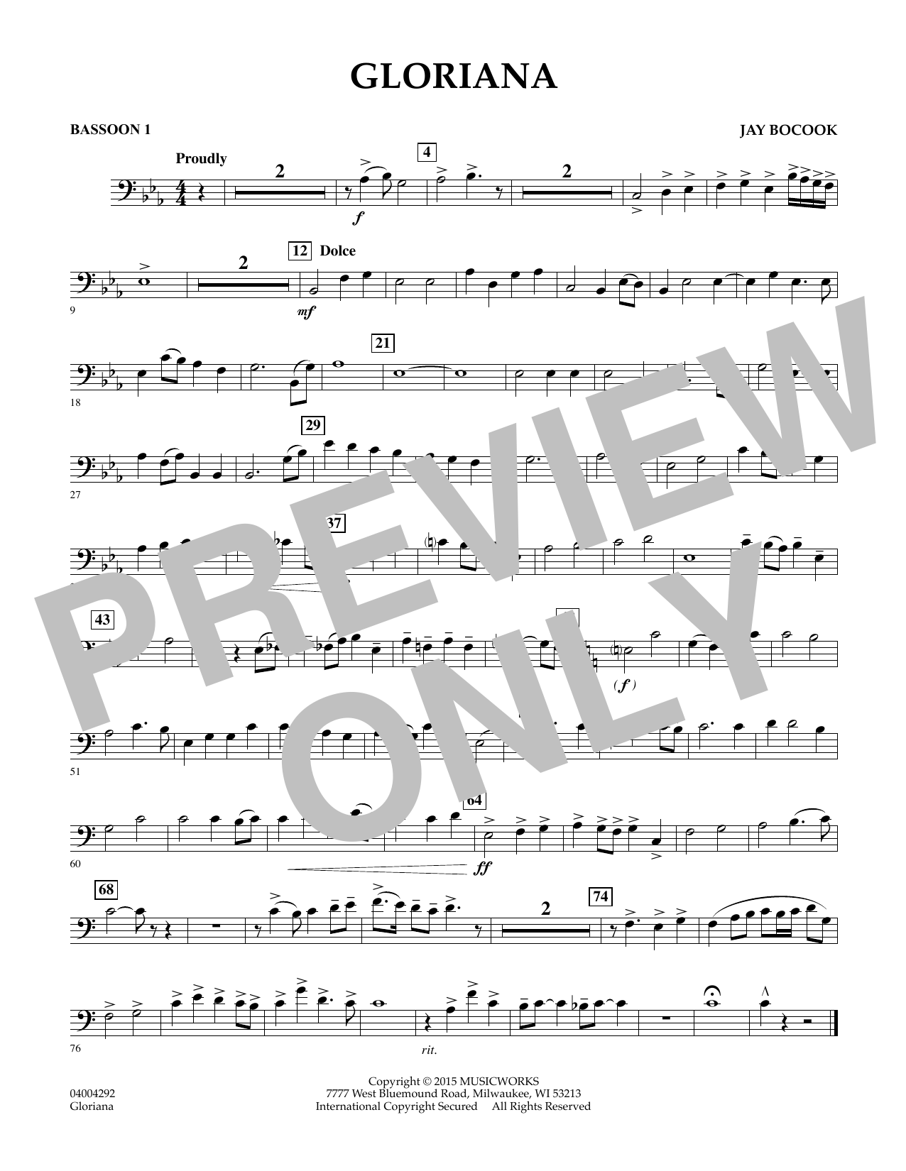 Gloriana' basiert auf dem englischen Gedicht'The Faerie Queene' von Edmund Spenser. Jay Bocooks Werk für sinfonisches Blasorchester besitzt einen königlichen Charakter mit dahingleitenden Melodien und fanfarenartigen Figuren der Blächbläser. Die optionale Orgelstimme erweitert das Klangerlebnis enorm.