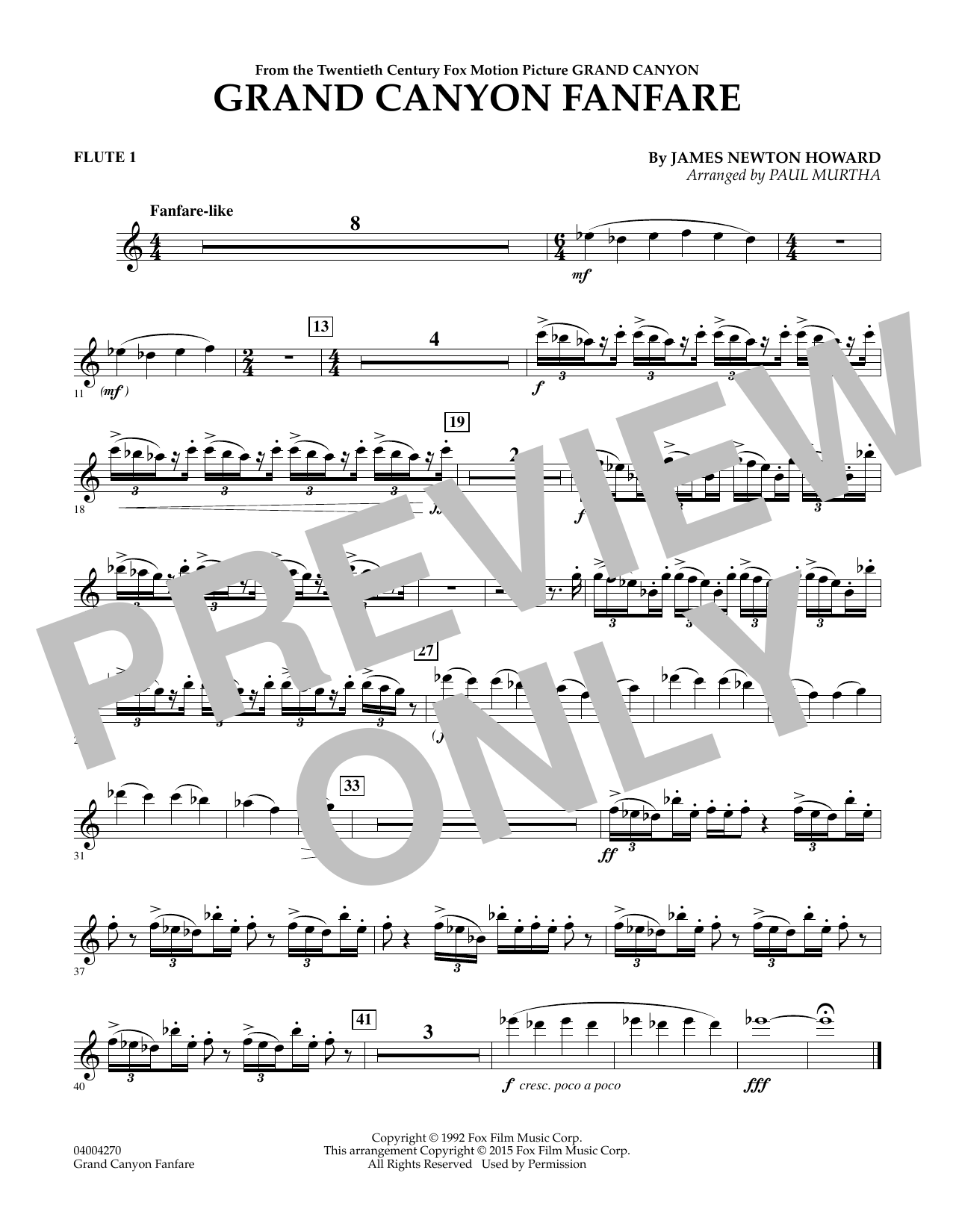 James Newton Howard composed this dynamic fanfare for the closing segment of the 1993 movie Grand Canyon (starring Danny Glover, Kevin Kline and Steve Martin). The film is now largely forgotten, however the music remains a vibrant and powerfulstatement and a very effective concert opener. Skillfully adapted by Paul Murtha with heroic brass figures, woodwind flourishes, and thundering percussion.