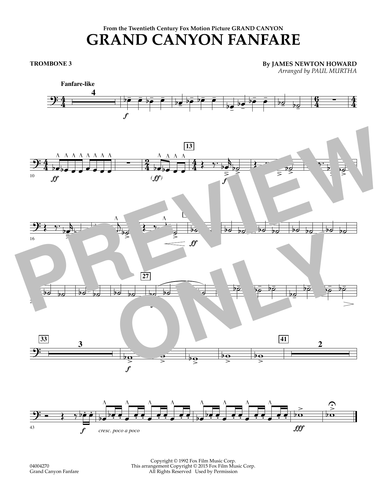 James Newton Howard composed this dynamic fanfare for the closing segment of the 1993 movie Grand Canyon (starring Danny Glover, Kevin Kline and Steve Martin). The film is now largely forgotten, however the music remains a vibrant and powerfulstatement and a very effective concert opener. Skillfully adapted by Paul Murtha with heroic brass figures, woodwind flourishes, and thundering percussion.