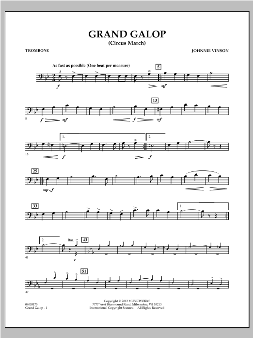An American musical phenomenon, the circus march (or gallop or screamer) was commonly used during the circus heyday as a way to stir up enthusiasm for the various acts and excite the crowds. Grand Galop is a concert march for young players in the circus march tradition, and is guaranteed to raise the excitement level of any concert or festival. With modest technical and range demands, you are invited to play this as fast as you dare! Dur: 1:50 (or less)