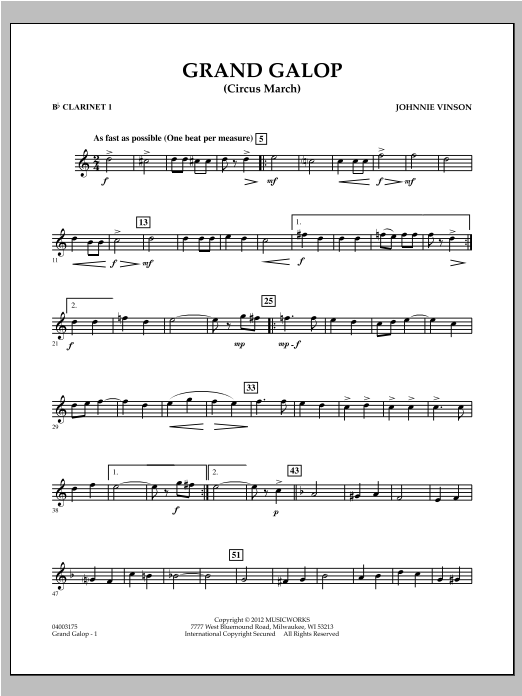 An American musical phenomenon, the circus march (or gallop or screamer) was commonly used during the circus heyday as a way to stir up enthusiasm for the various acts and excite the crowds. Grand Galop is a concert march for young players in the circus march tradition, and is guaranteed to raise the excitement level of any concert or festival. With modest technical and range demands, you are invited to play this as fast as you dare! Dur: 1:50 (or less)