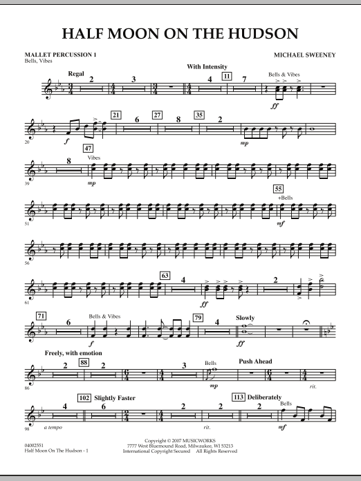Nearly 400 years ago (in 1609) Henry Hudson and his ship, the Half Moon, explored the majestic river that was later to bear his name. Half Moon on the Hudson pays tribute to this area of New York and the spirit of exploration and adventure. A regal fanfare announces the beginning of the work, followed by an energetic and rhythmic section that features various sections of the band answering one another. An emotional and chorale-like middle section provides a calmer mood along with lush harmonizations. The brass and percussion sections herald the final segment, driving to a dramatic conclusion of this rewarding work for winds.