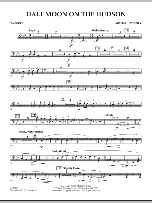 Nearly 400 years ago (in 1609) Henry Hudson and his ship, the Half Moon, explored the majestic river that was later to bear his name. Half Moon on the Hudson pays tribute to this area of New York and the spirit of exploration and adventure. A regal fanfare announces the beginning of the work, followed by an energetic and rhythmic section that features various sections of the band answering one another. An emotional and chorale-like middle section provides a calmer mood along with lush harmonizations. The brass and percussion sections herald the final segment, driving to a dramatic conclusion of this rewarding work for winds.