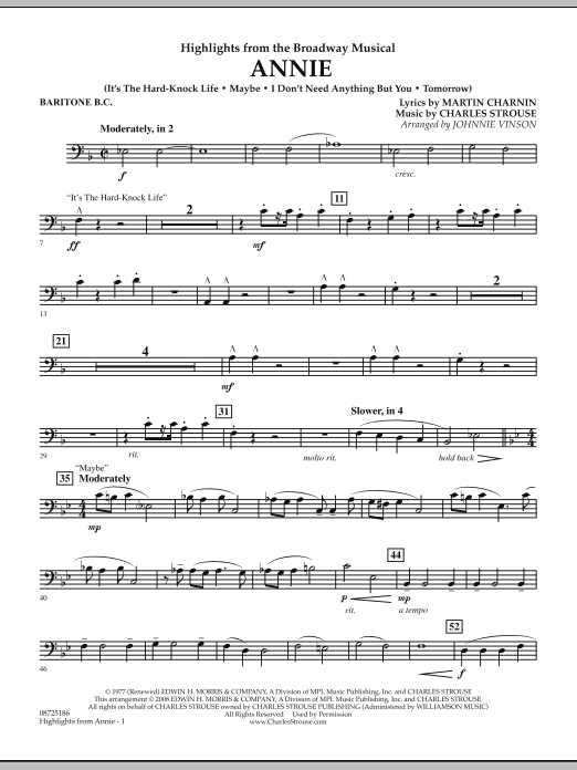 Mit einer Fülle von Ohrwürmern und einer herzerwärmenden Geschichte ist Annie zu einem der beliebtesten Broadway-Musicals aller Zeiten geworden. Hier ist ein großartig klingendes Medley für junge Bands von Johnnie Vinson, das Folgendes enthält: It's a Hard-Knock Life, I Don't Need Anything but You, Maybe und natürlich Tomorrow.