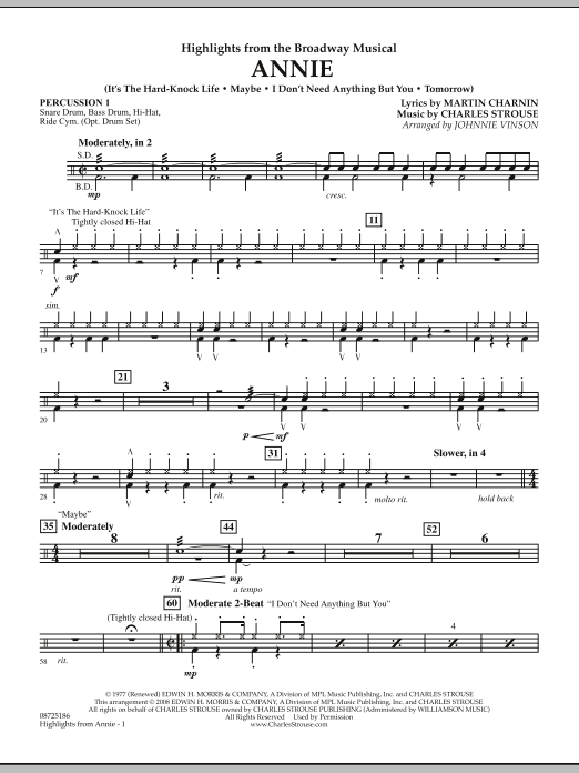 Mit einer Fülle von Ohrwürmern und einer herzerwärmenden Geschichte ist Annie zu einem der beliebtesten Broadway-Musicals aller Zeiten geworden. Hier ist ein großartig klingendes Medley für junge Bands von Johnnie Vinson, das Folgendes enthält: It's a Hard-Knock Life, I Don't Need Anything but You, Maybe und natürlich Tomorrow.