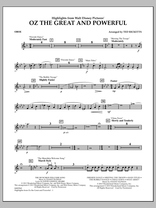 From the stunning movie blockbuster Oz the Great and Powerful comes this distinctive and varied soundtrack from Danny Elfman. Featuring some of the film's lighter as well as darker moments here is a great sounding medley for band.