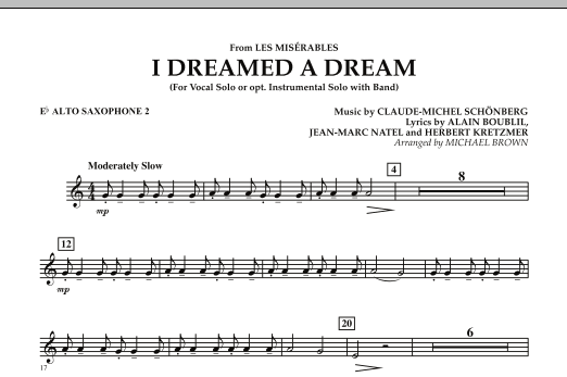 Diese berührende Ballade aus dem Erfolgsmusical "Les Miserables" hat sich bereits als Klassiker etabliert, lange bevor Susan Boyle bei Britain's Got Talent den Durchbruch schaffte. Dieses gekonnt ausgearbeitete Arrangement kann für einen Sänger oder eine beliebige Anzahl von Instrumentalsoli (einschließlich Klarinette, Altsaxophon, Trompete oder F-Horn) verwendet werden. Sicherlich ein Konzert-Highlight, wo auch immer es aufgeführt wird.