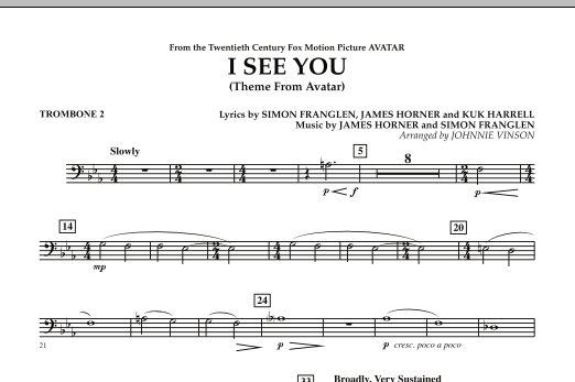 From the groundbreaking movie blockbuster Avatar, here is the main theme used in the end credits. Johnnie Vinson's sensitive arrangement features light woodwind scoring in the beginning then builds into a powerful setting for the entire ensemble.