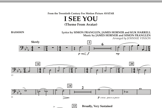 From the groundbreaking movie blockbuster Avatar, here is the main theme used in the end credits. Johnnie Vinson's sensitive arrangement features light woodwind scoring in the beginning then builds into a powerful setting for the entire ensemble.