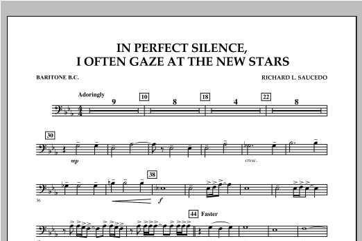 On a Sunday afternoon in May of 2011 tornados devastated the city of Joplin, Missouri. In Perfect Silence, I Often Gaze at the New Stars is intended as a musical tribute to those who lost their lives that day and to those heroes who gave everything they could to help others. The music is a beautiful blending of sounds and moods, and carries with it a full range of emotions from reflective quiet moments to the massive outpouring from the entire ensemble. An evocative and moving work for band that will resonate with both performers and listeners. Dur: 3:50